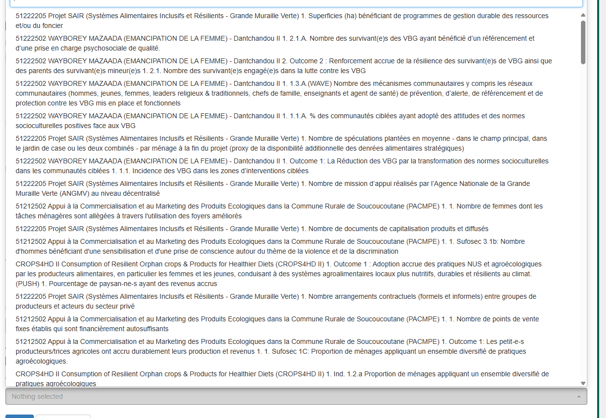De plus, la dénomination des indicateurs pouvant être liés est irritante. Pourrais-tu séparer les différents éléments des noms (par exemple, code du projet, nom du projet, code de l'indicateur et nom de l'indicateur) à l'aide d'une barre verticale « | » ? Je réduirais également les noms des projets et les indicateurs de projet à 15 caractères (en indiquant ensuite à l'aide de « ... » que le nom n'est pas affiché dans son intégralité).